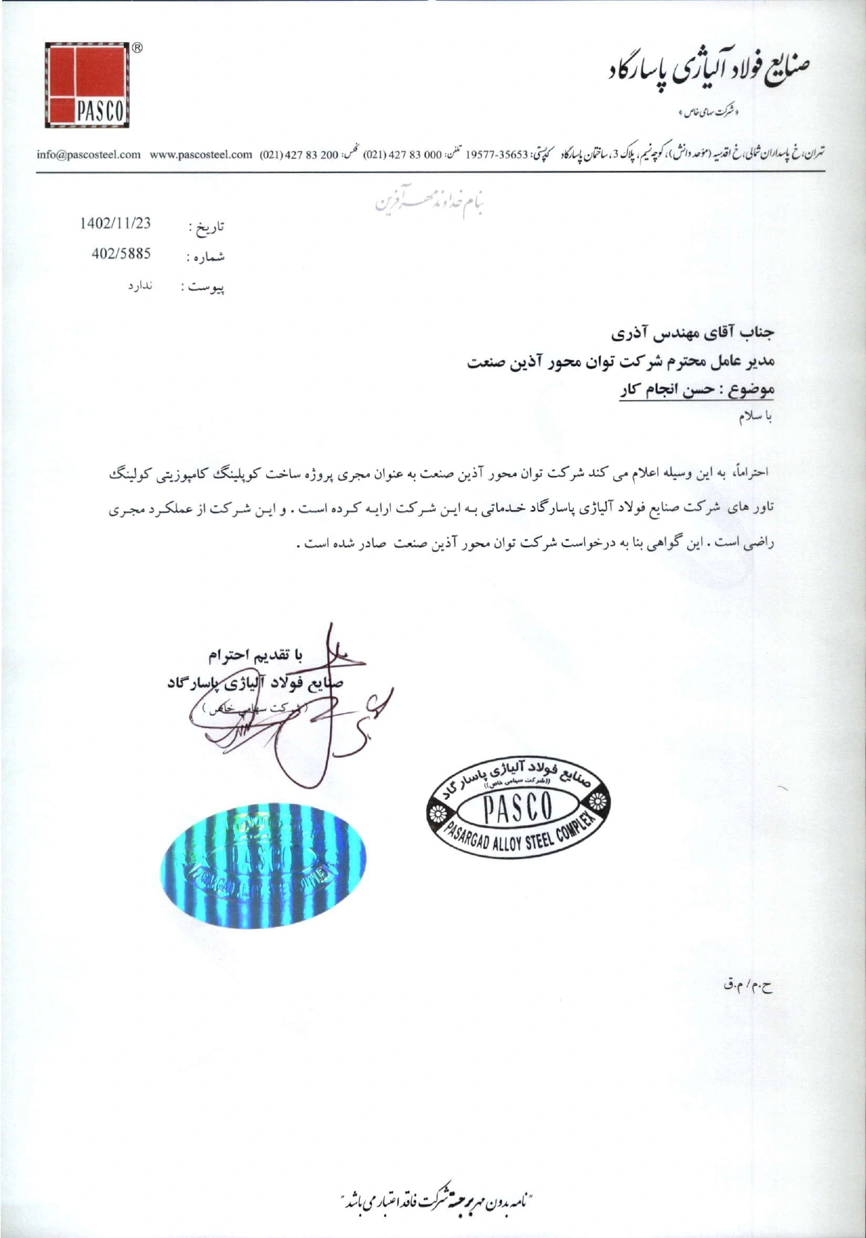 الموافقاتتسعى شركة توان محور آذین صنعت، مع التركيز على الجودة، واستخدام المواد الأولية القياسية، والتحكم الدقيق في عملية الإنتاج، إلى تقديم منتجات موثوقة ومتوافقة مع المعايير الصناعية. يتم إخضاع كل منتج قبل طرحه لمراقبة فنية واختبارات جودة لضمان أداء مستقر وموثوق للعملاء.