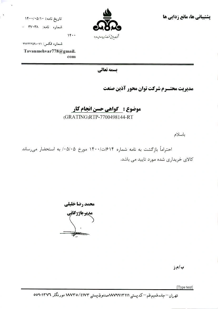 الموافقاتتسعى شركة توان محور آذین صنعت، مع التركيز على الجودة، واستخدام المواد الأولية القياسية، والتحكم الدقيق في عملية الإنتاج، إلى تقديم منتجات موثوقة ومتوافقة مع المعايير الصناعية. يتم إخضاع كل منتج قبل طرحه لمراقبة فنية واختبارات جودة لضمان أداء مستقر وموثوق للعملاء.